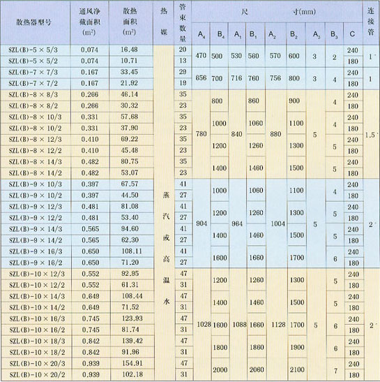 SZL(B)型翅片管散熱器,用無(wú)縫鋼管φ25×2.5mm作為基管,鋁孔翅片管外徑為直徑57mm,根徑為φ26.5mm,片距為2.8mm組成。散熱性能好、使用可靠、耐腐蝕性、光潔、美觀。應(yīng)用于乳品、啤灑、食品、淀粉、化工、造紙、機(jī)械、醫(yī)-藥、空調(diào)、印染等行業(yè)。